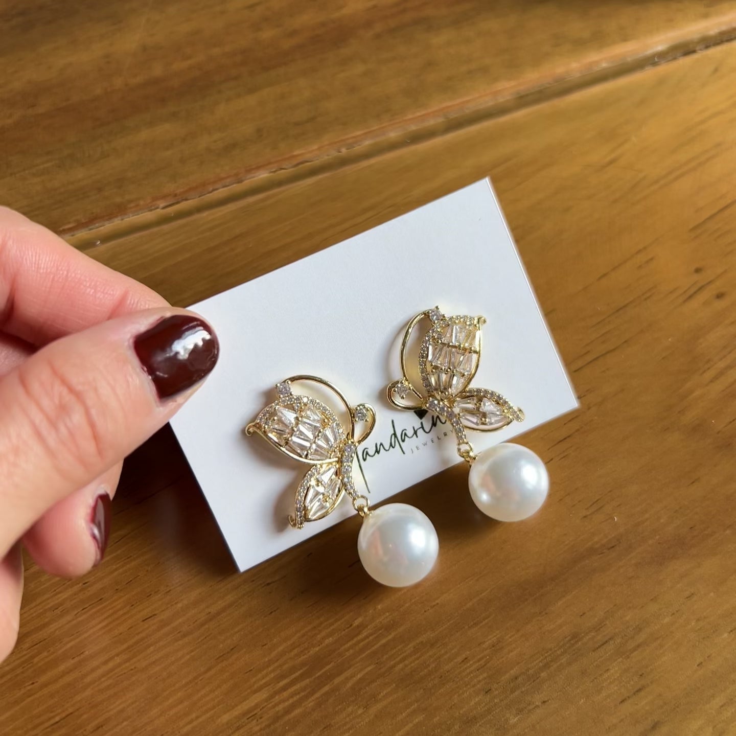 Este arete cautivador presenta una mariposa exquisitamente elaborada con pedrería resplandeciente y una perla de brillo envolvente.